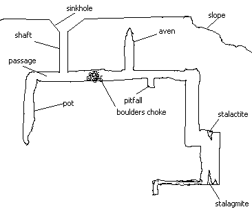 Элементы рельефа каскадные ванночки - gour pools карстовая воронка - sinkhole склон - slope шахта, вертикальный колодец - shaft, pitch cыпь - boulders очень большие камни, скалы - rocks шкуродер - squeeze ползуха (на коленях) - hand and knees crawl ползуха (на животе) - flat out щель - rift горизонтальная щель с плоским низким потолком - bedding plane зал - chamber яма, глухой колодец - pot тур, каменный ориентир - pot (да, тоже слово). яма - pit, pitfall зацеп - hold завал - boulder choke глина - mud канатная дорога, фуникулер - cable car